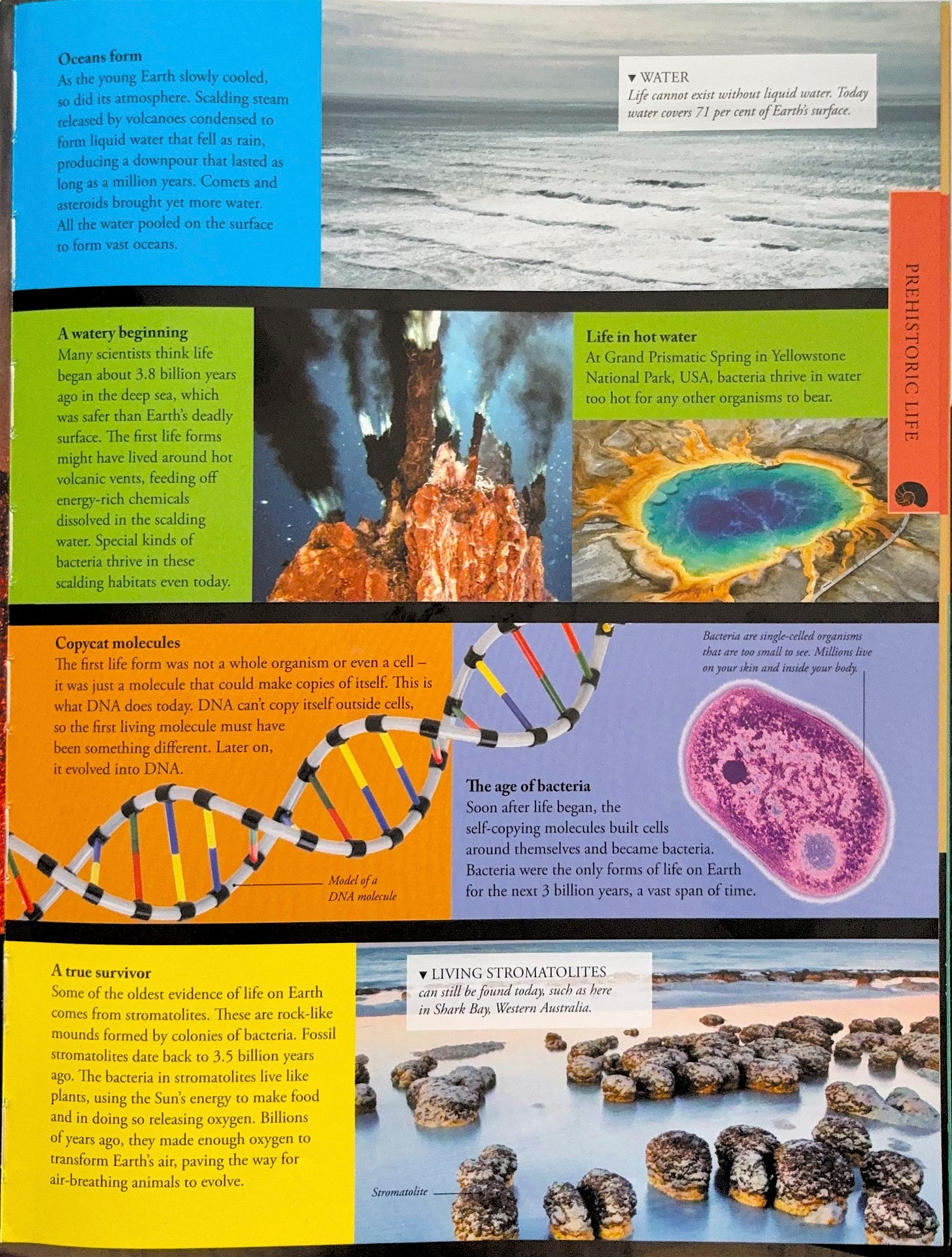 “Some of the oldest evidence of life on Earth comes from stromatolites…Fossil stromatolites date back to 3.5 billion years ago. The bacteria in stromatolites live like plants, using the Sun’s energy to make food and in doing so releasing oxygen. Billions of years ago, they made enough oxygen to transform Earth’s air, paving the way for air-breathing animals to evolve.”
